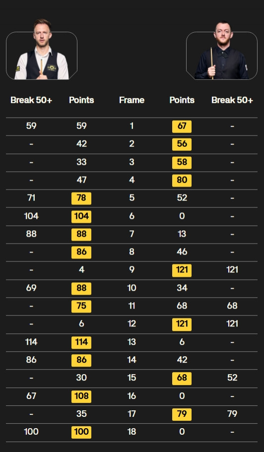 全场比赛贾德·特鲁姆普打出三杆破百(104、114、100)和六杆50+(59、71、88、69、86、67),马克·艾伦打出两杆破百(121、121)和三杆50+(68、52、79)。