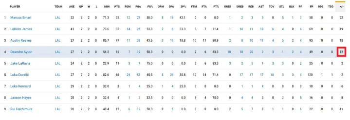 据NBA官网知道,近两场比赛艾顿正负值12——队内仅次于斯马特、詹姆斯和里夫斯。