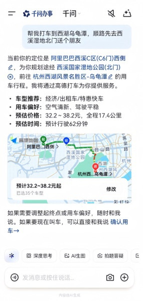千问还让“打车”具备了记挂与预约才智。用户只需告诉千问家庭和公司地址,即可平直让千问“帮我打车回家”或“打车去公司”;说一句“下昼6点半放工,帮我约车回家”,系统即可自动结合时间并完成预约。跟着这些才智的徐徐加强,千问将为用户带来更合适个东谈主偏好的出行服务。