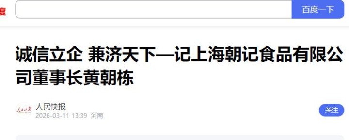 2026年3月11日,东谈主民快报发布著述,称许上海朝记食物有限公司董事长黄朝栋。